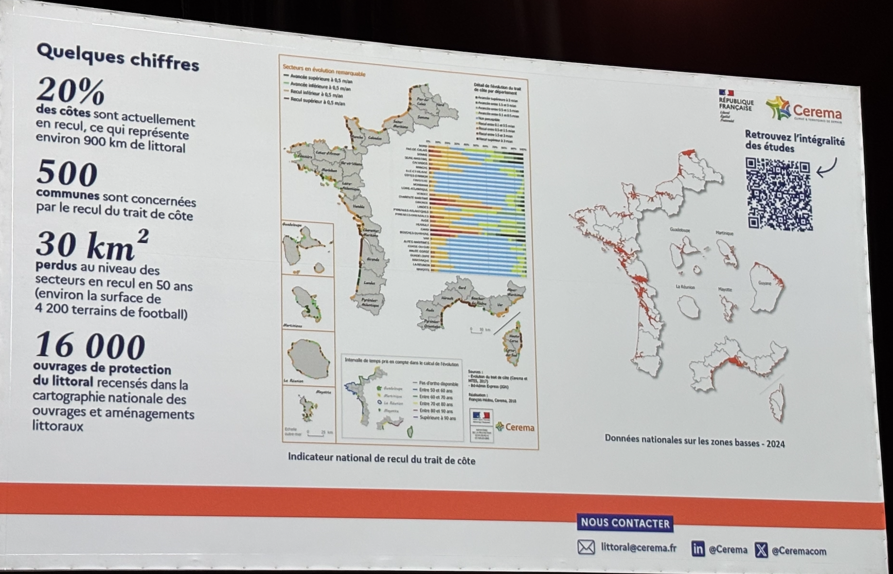 Le Cerema, établissement public spécialisé dans l’expertise environnementale, y a rappelé l’ampleur du phénomène : 20 % du littoral français recule, avec près de 2 millions de personnes exposées au risque de submersion marine.