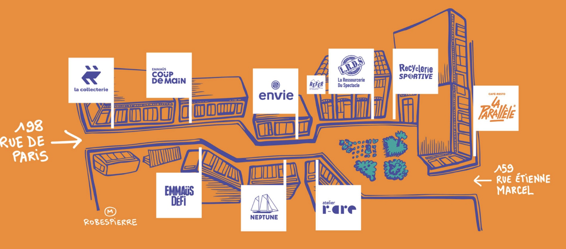 Pensé comme un pôle de services de proximité, « La Venelle » rassemble sous un même toit des boutiques de seconde main (Emmaüs Défi, Envie, La Collecterie, Recyclerie Sportive, Ressourcerie du Spectacle, Neptune, Atelier R-ARE…), un atelier participatif pour apprendre à réparer (couture, électro, vélo, menuiserie), les locaux du REFER, un café-cantine culturel et une cour végétalisée. Objectif : équiper à prix justes, transmettre des savoir-faire et créer du lien. Le site crée ou pérennise 50 emplois, dont 80 % en insertion, dans la vente, la réparation, la logistique et l’accueil, avec un accompagnement renforcé vers l’emploi durable.